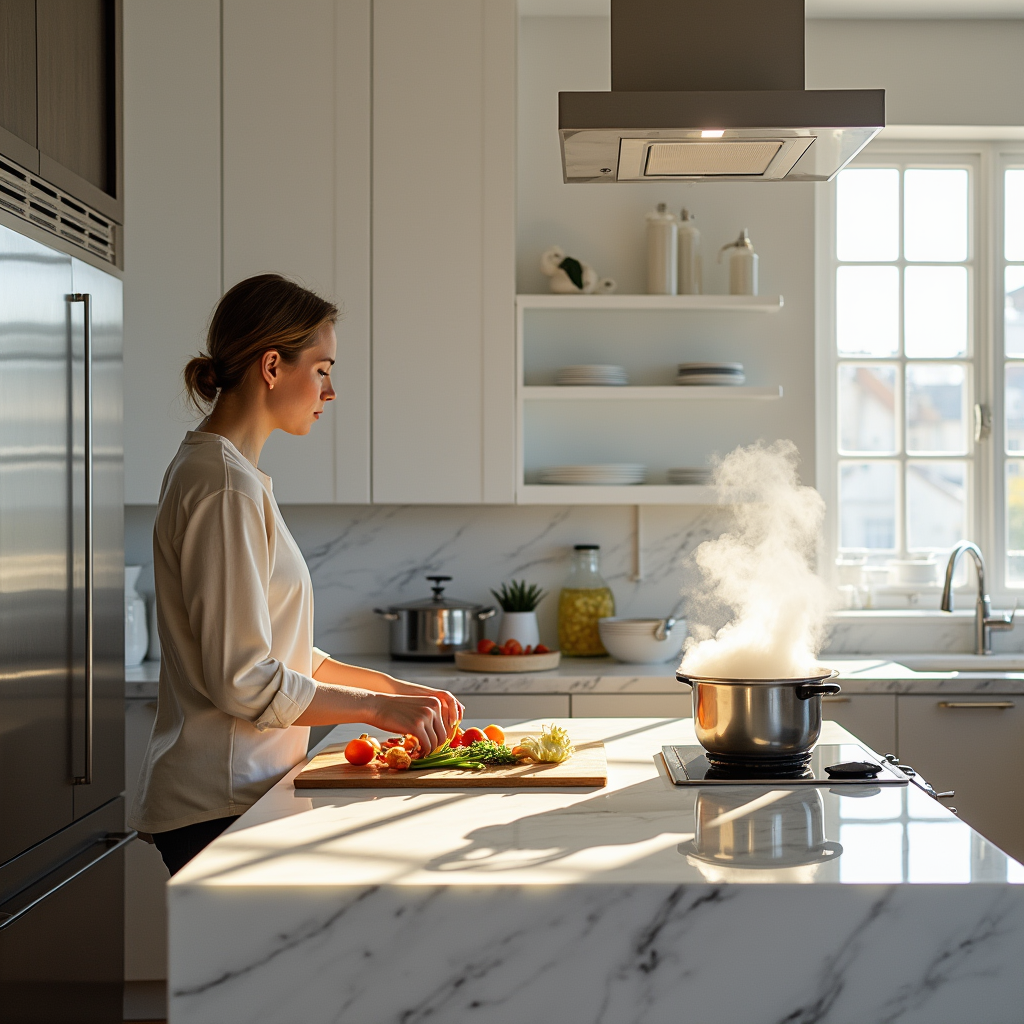 Mom is cooking in the kitchen.