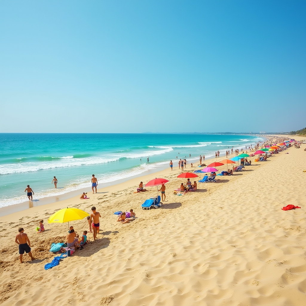 In French, 'plage' refers to a sandy or pebbly shore by the sea or a lake. It's a common word for holiday destinations and summer activities.