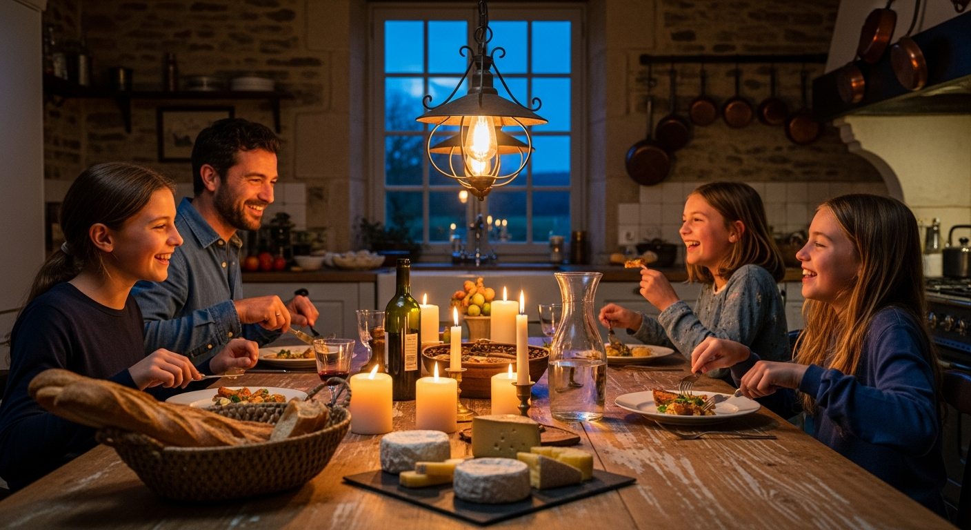 Everyday phrases for sharing a meal with family in France. Learn the vocabulary for eating, drinking, and family relationships set around a classic French dinner table.