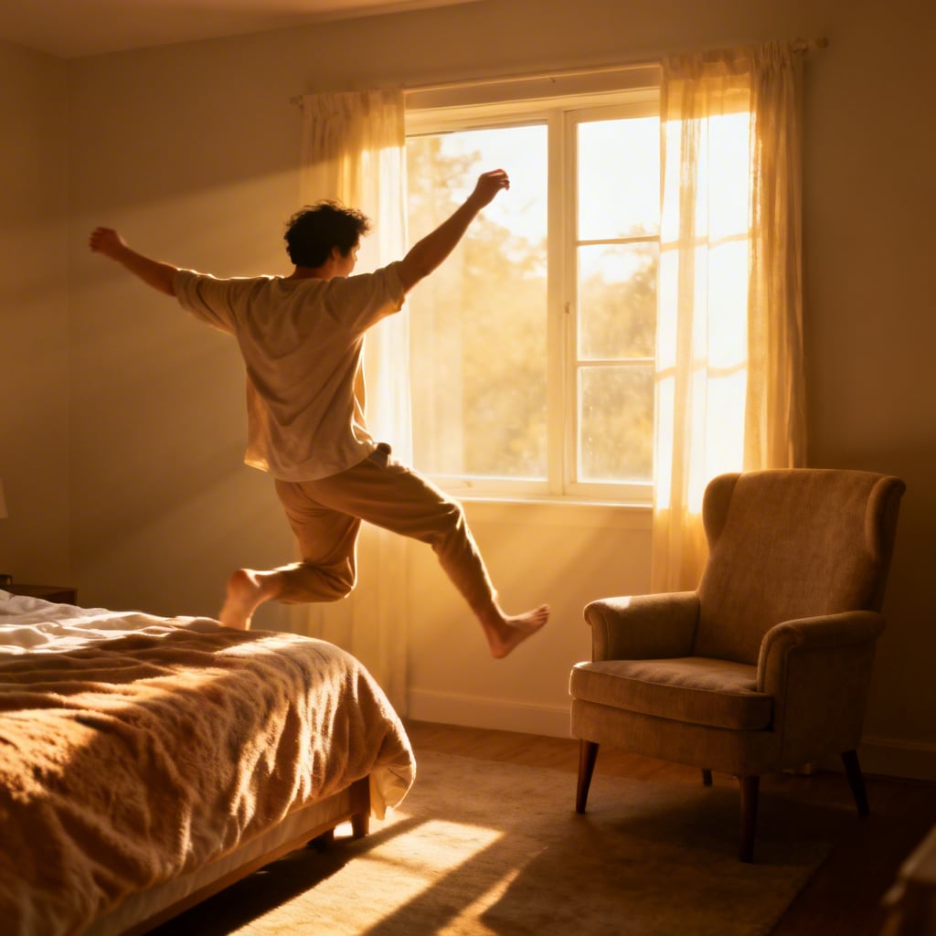 He stands up from the sofa.